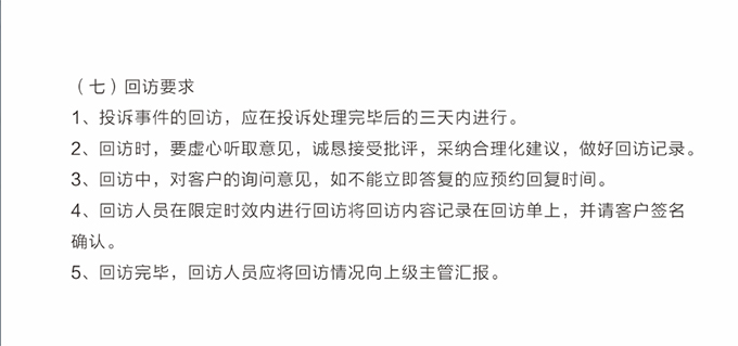 1、导购、店面、售后人员接到维修等售后问题来电时,第一时间先安抚好客户情绪,认真倾听客户的问题描述,并尽量问清存在的问题和故障现象,应详细记录顾客名字、联系电话、地址、商品型号、问题等信息,将这些信息登记于《售后服务跟踪单》上后,再次确认客户问题及诉求,看是否有遗漏,确认无误后回复客户多长时间给他答复;